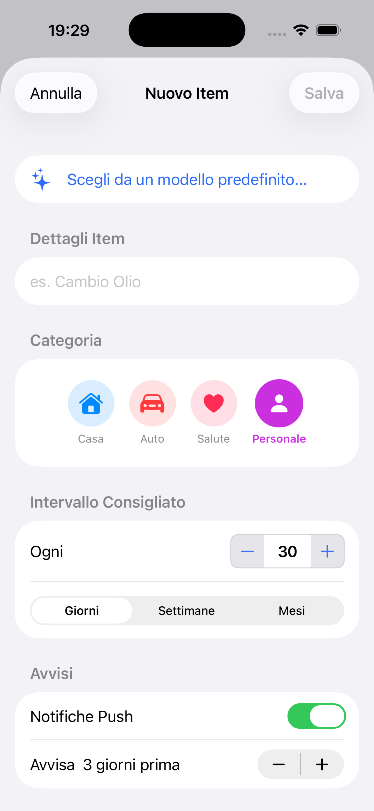 Crea un item e scegli l'intervallo di promemoria. "Cambio olio ogni 6 mesi", "Annaffia piante ogni settimana"...